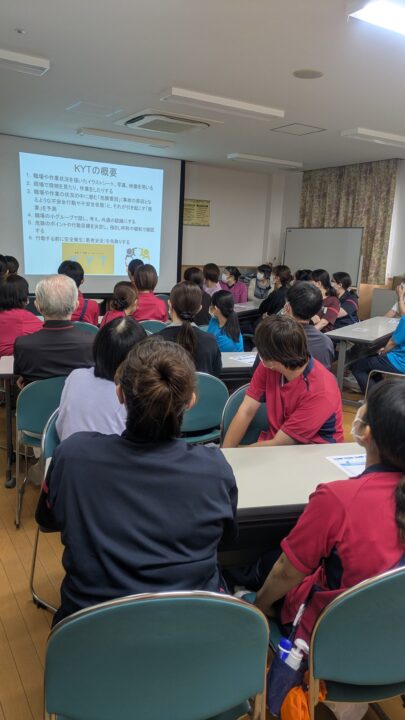 KYT(危険予知トレーニング)とは、業務中に起こり得る危険を事前に予測し、事故やけがを防ぐためのトレーニングです。医療現場では、ちょっとした見落としが大きな事故に繋がることもあるため、安全意識を高めることが特に重要です。